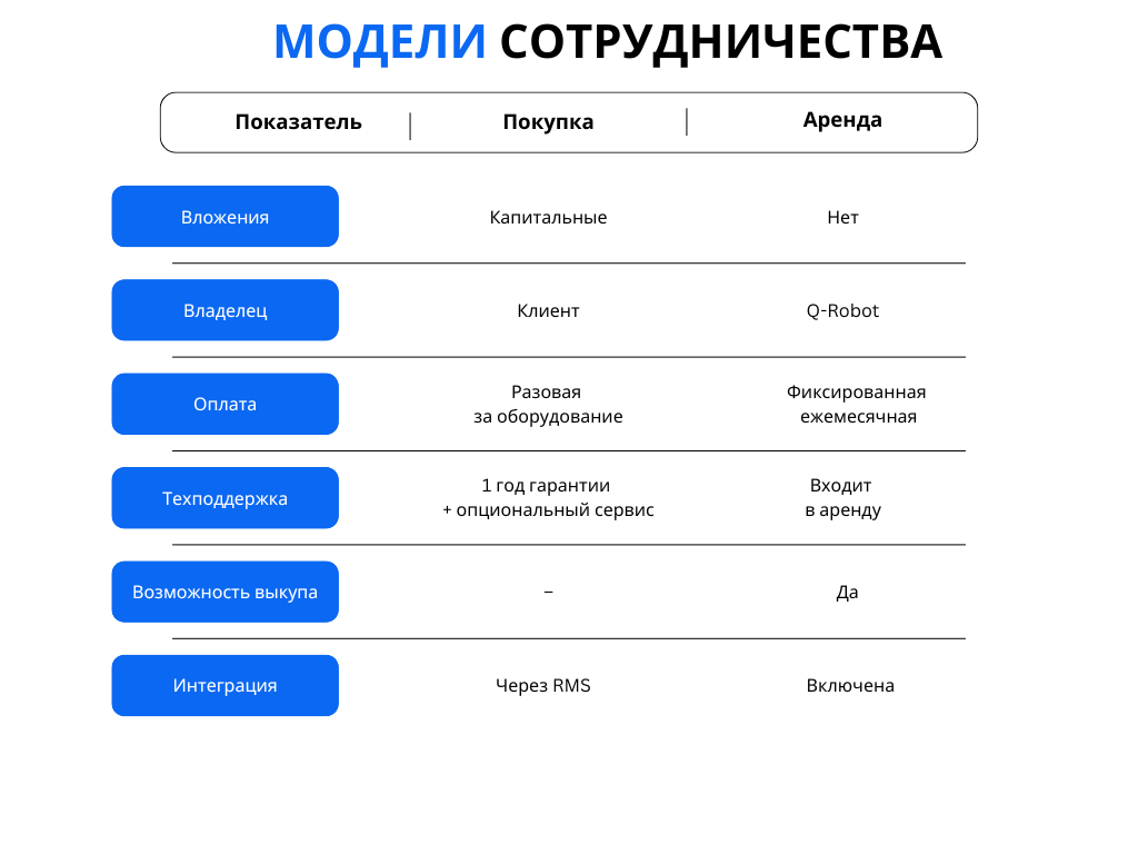 Такие модели позволяют компаниям быстрее начать процесс роботизации, минуя длительные этапы согласования крупных инвестиционных бюджетов и поиска свободных капиталов. В результате предприятие получает технологическое преимущество здесь и сейчас, покрывая расходы на автоматизацию из текущей прибыли.