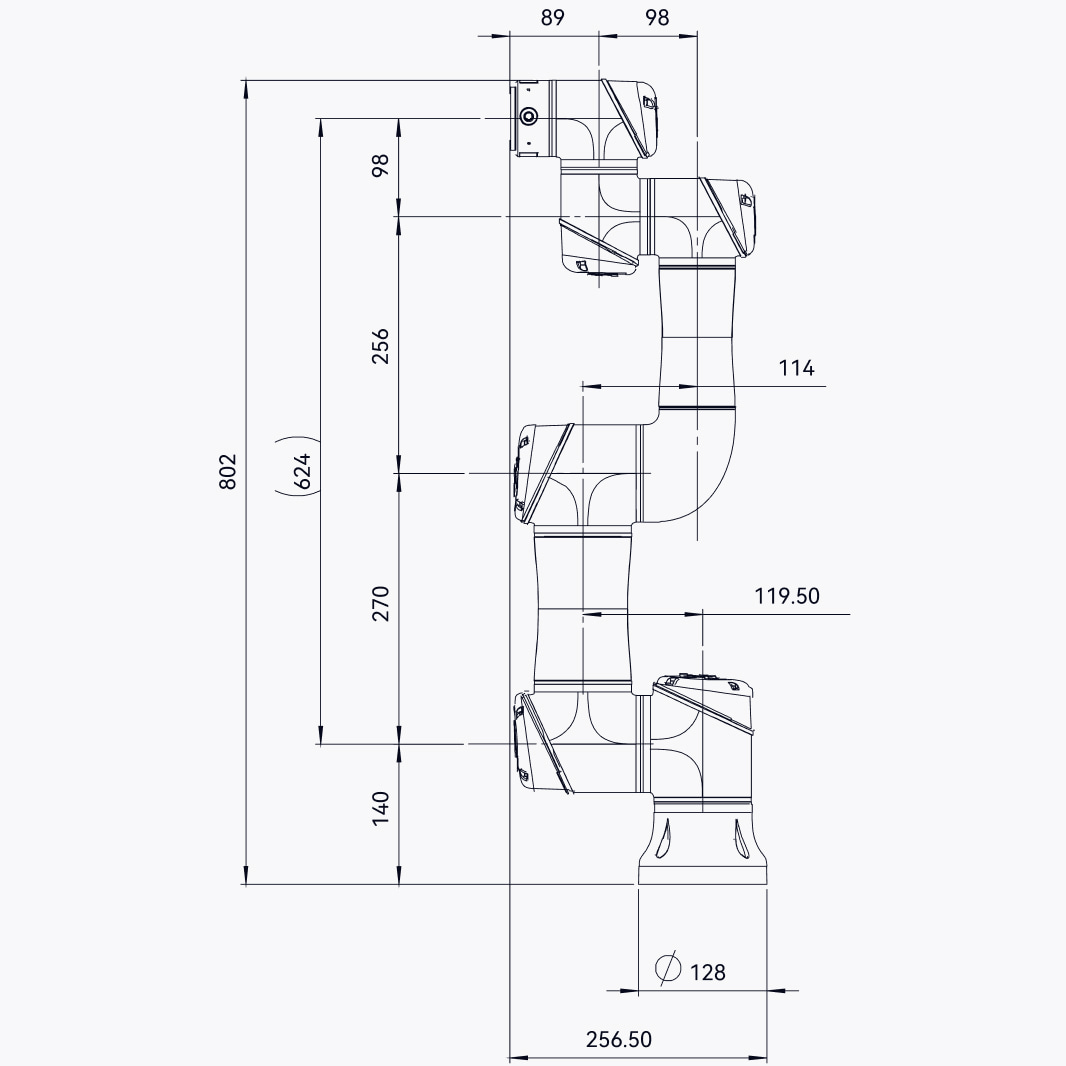 Коллаборативный робот EC63 (вес 13 кг; общая длина кобота 802 мм; площадь опоры Ø128 мм). В комплект входит стандартный кабель длиной 5,5 м (также доступны длины кабеля: 1,5 м; 3 м; 8 м; 10 м).