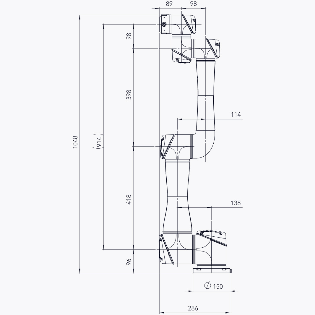 Коллаборативный робот EC66 (вес 17,5 кг; общая длина кобота 1048 мм; площадь опоры Ø150 мм). В комплект входит стандартный кабель длиной 5,5 м (также доступны длины кабеля: 1,5 м; 3 м; 8 м; 10 м).
