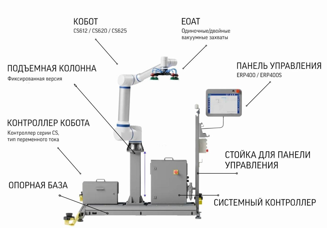 Решение для паллетирования серии CP с фиксированной колонной построено на модульной концепции. Такая конфигурация оптимальна для задач с постоянными параметрами паллетирования и высокой повторяемостью процессов. Манипулятор и система управления реализованы как отдельные автономные блоки, простые в обслуживании и удобные для эксплуатации.